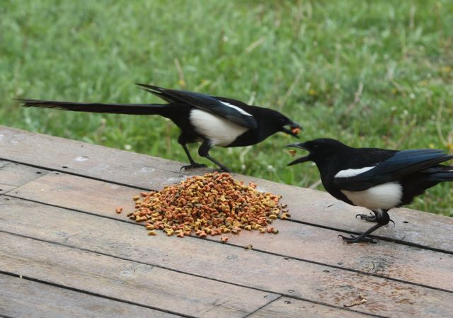 John and Durrae moved to Bozeman from Pennsylvania. They've lived here almost as long as we've lived in Ohio--17 years or so. But they still love the magpies.They love them so much they buy big bags of cat food to keep them fat and sassy.