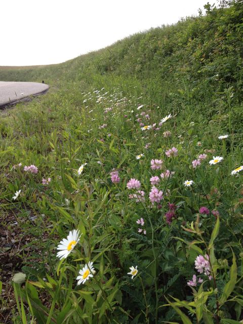 Field daisies, red clover, and crown vetch. Not a one of them native, but lovely nonetheless, especially in this light, at this hour. Black dot on curve: leading the way.