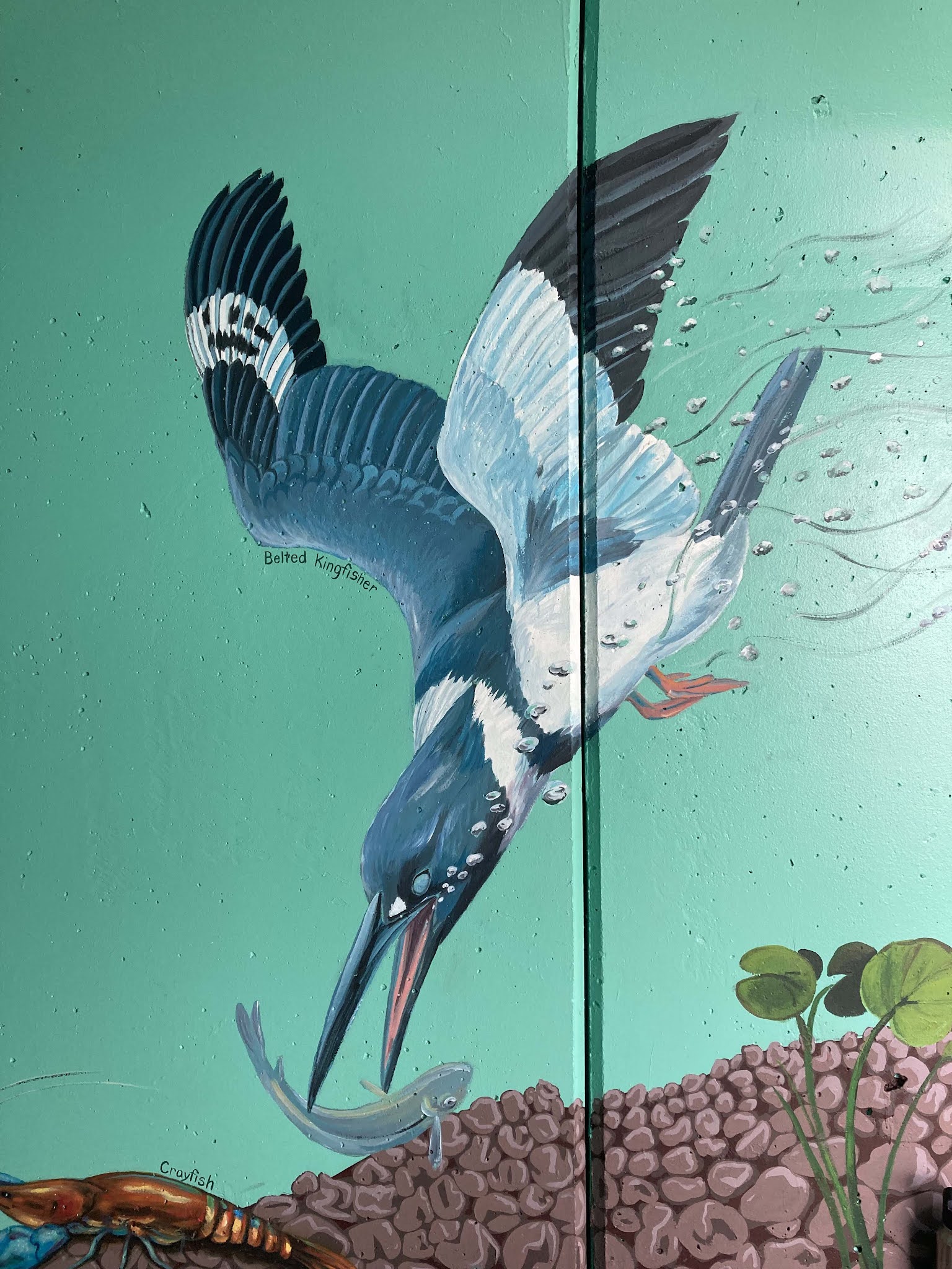 The mural survived the week between being painted and being protected, thank goodness! And during that week I looked at photos I'd taken of my work, thinking about what might still need to be done. Something about the kingfisher was buggin' me. Finally it hit me: I'd forgotten to paint bars on its underwings, and upperwings, too! and it was too white! Aack!